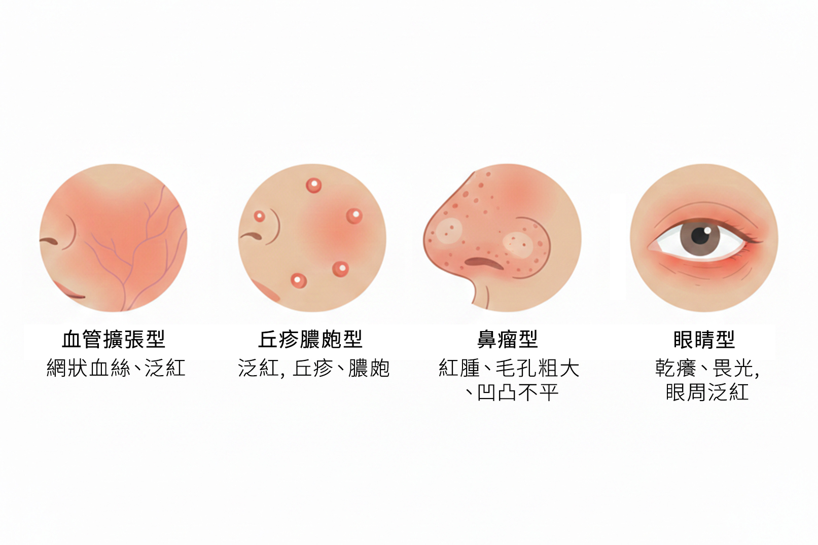 酒糟肌的表現千變萬化,臨床上主要分為4大類型。患者可能出現單一類型,也可能同時混合多種症狀,且隨著病程進展,症狀可能會發生變化。