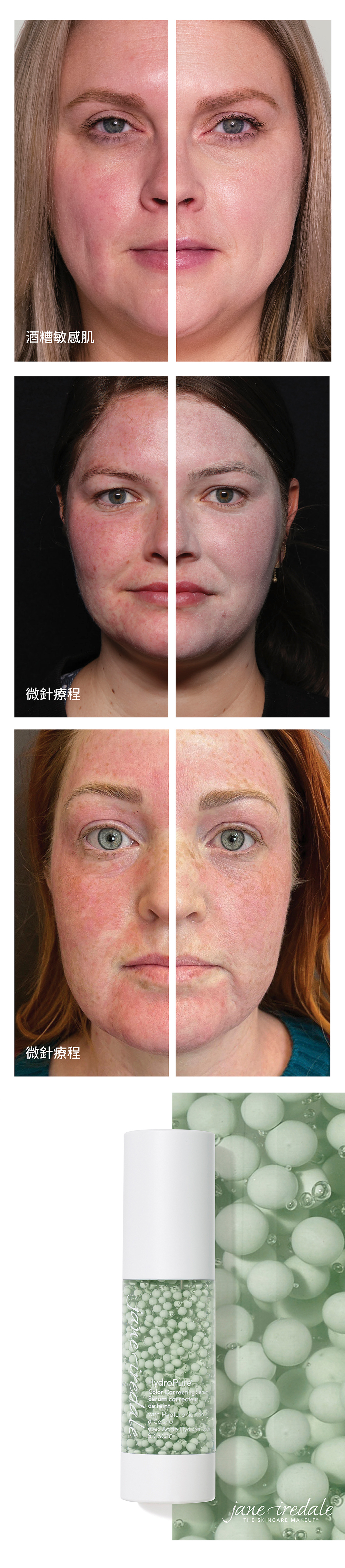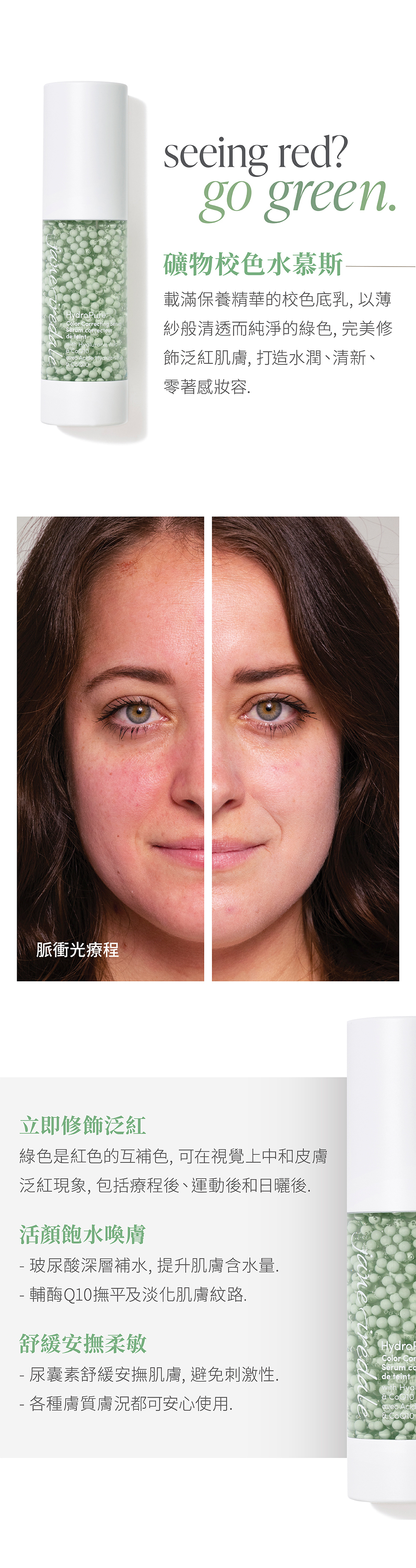 + 立即修飾泛紅:視覺上中和皮膚泛紅現象,包括療程後、運動及日曬後。