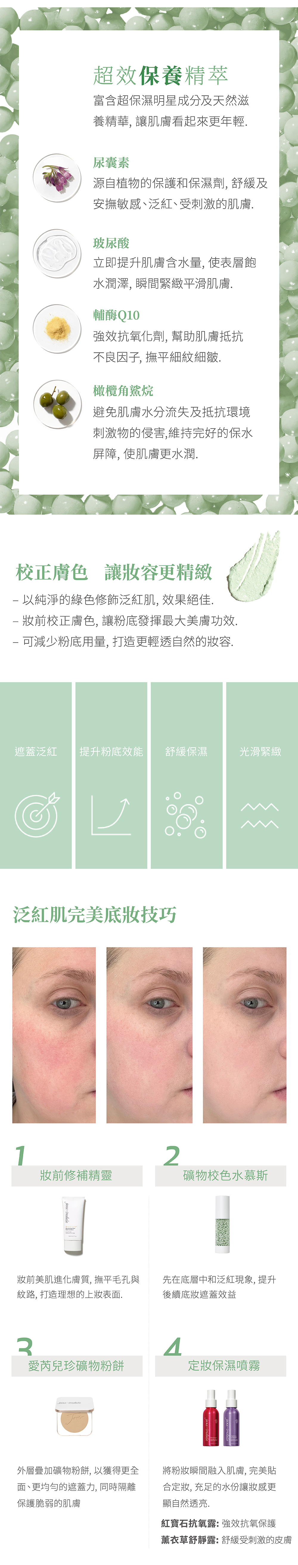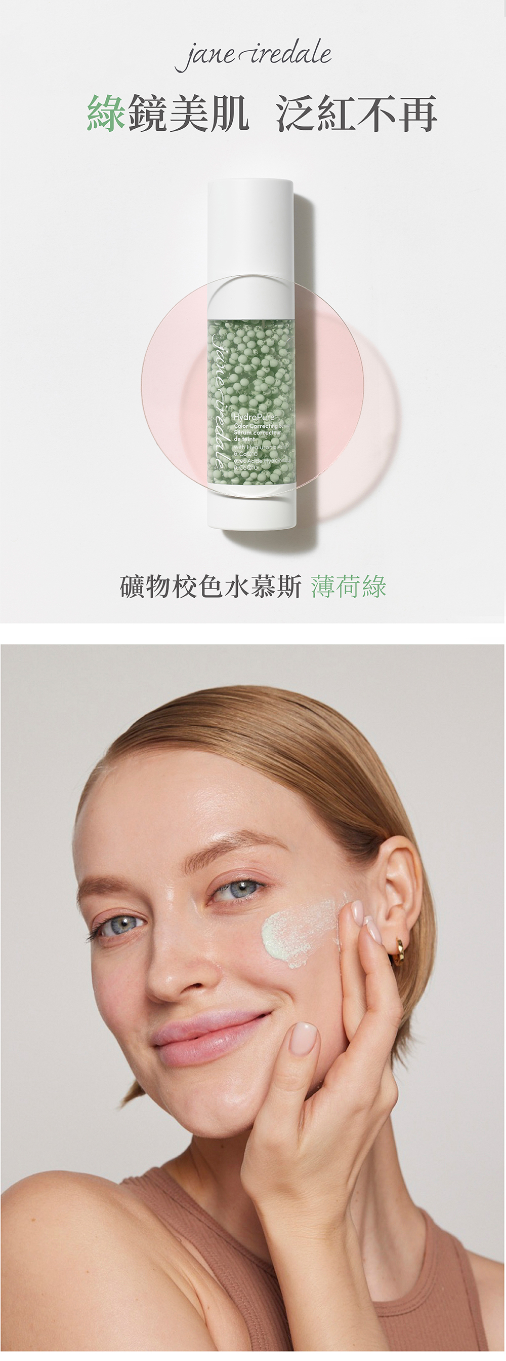 載滿保養精華的礦物校色飾底乳,薄紗般輕透的水慕斯質地,屬於裸膚系礦物粉底,其純淨清新的綠色可大幅修飾泛紅肌,提升後續粉底的美膚效能,打造勻淨、水潤、零著感妝容。