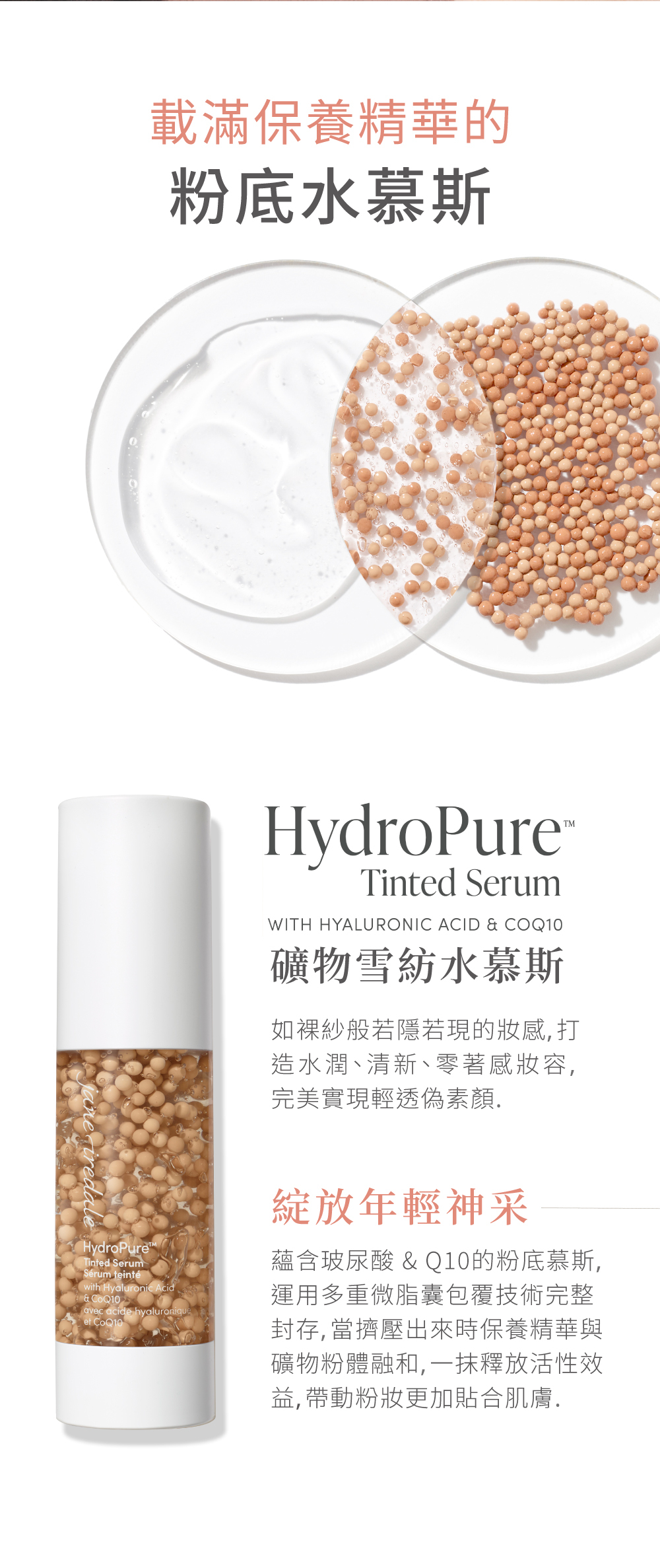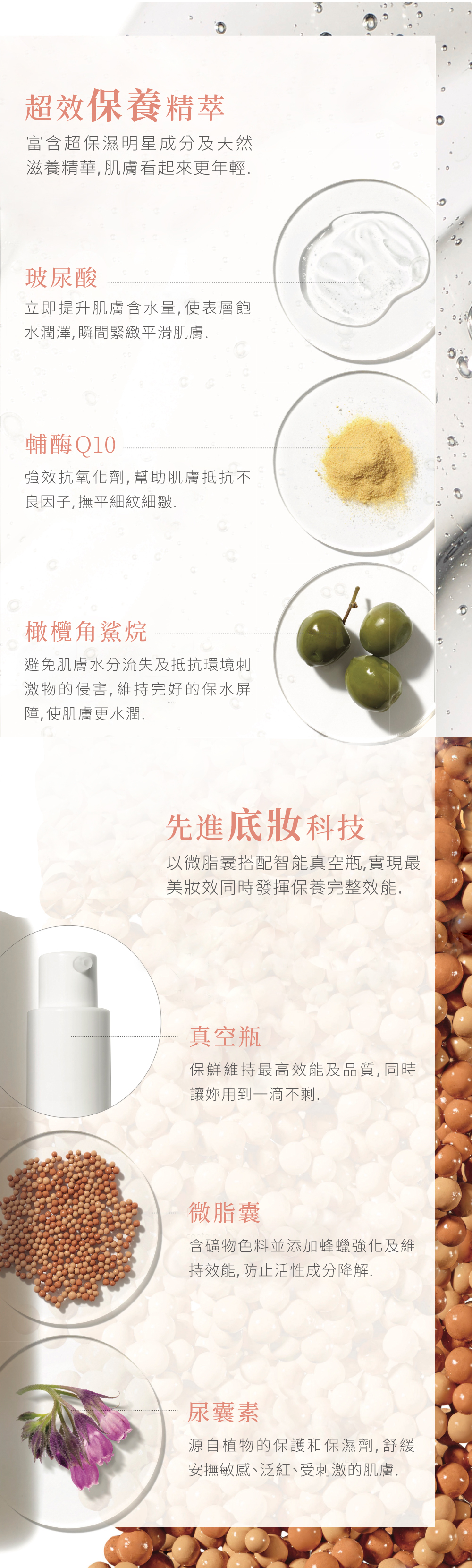 蘊含滿滿保養精萃的潤色精華,既是粉底液,也是精華液,屬裸膚系礦物粉底。運用多重微脂囊包覆技術完整封存,當擠壓出來時保養精華與礦物粉體融和,一抹釋放活性效益,帶動粉妝更加貼合肌膚,呈現裸紗妝感,打造高透明度雪紡肌,完美實現漂亮偽素顏,其活性保養效益隨著時間慢慢釋放到肌底,達到滋養、抗老、保濕及淡化細紋的效益,綻放明亮、青春氣息。