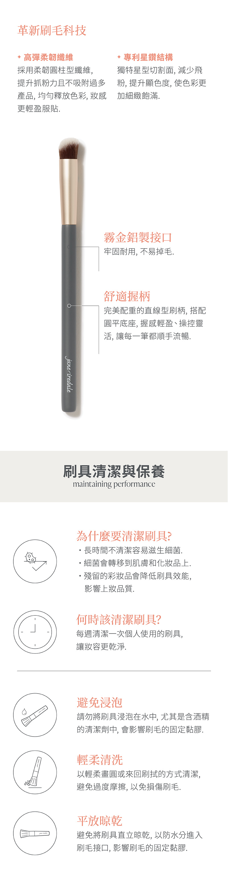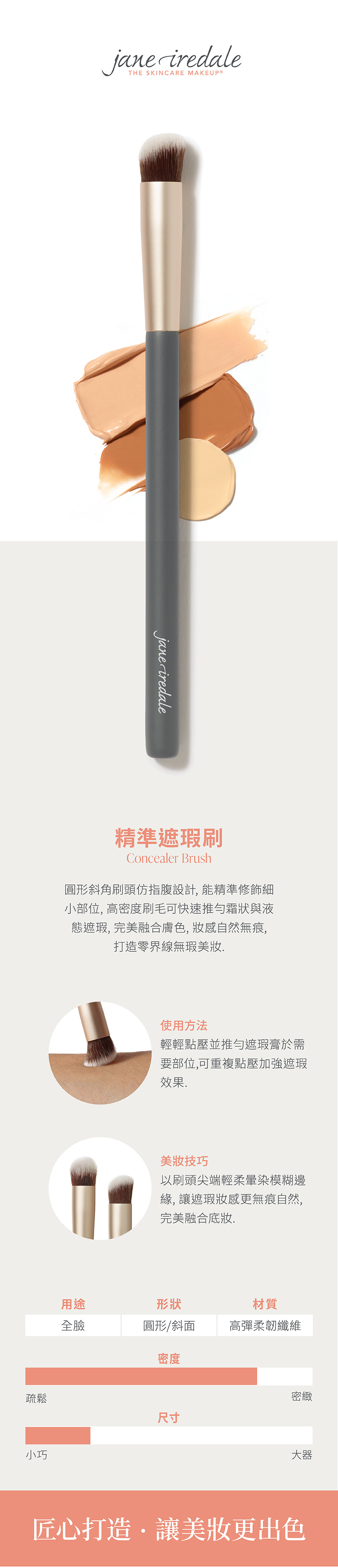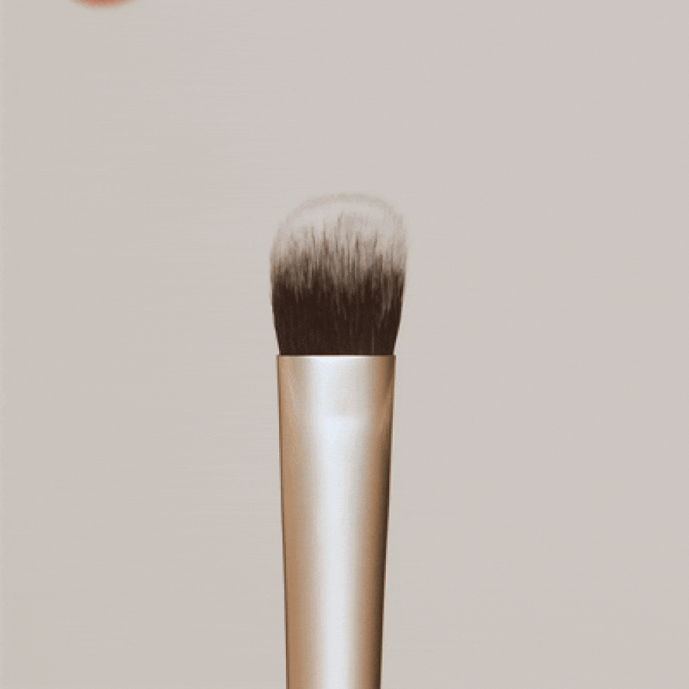 圓形斜角刷頭仿指腹設計,能精準修飾細小部位,高密度刷毛可快速推勻霜狀與液態遮瑕,完美融合膚色,妝感自然無痕,打造零界線無瑕美妝。