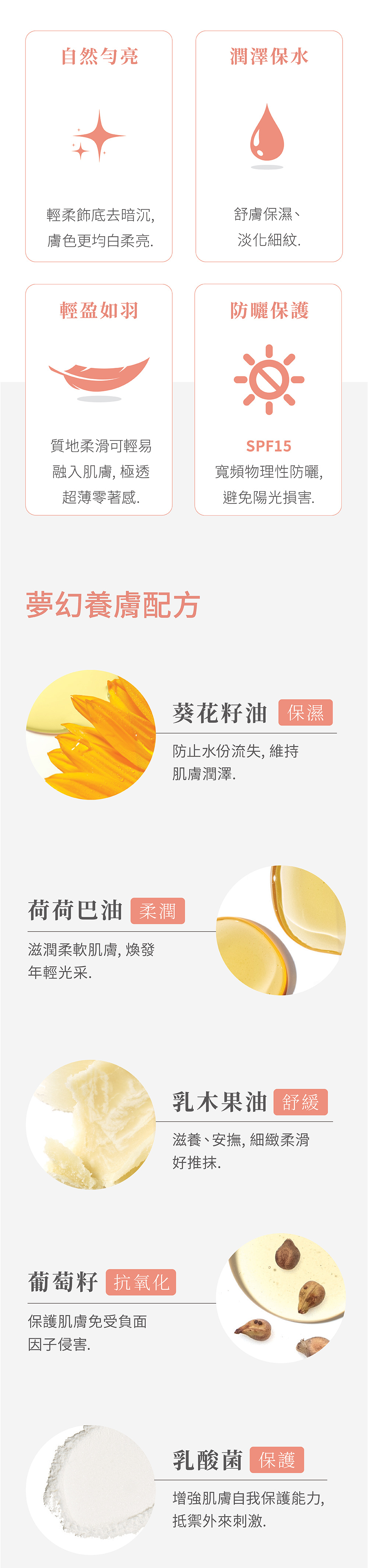 讓妳素顏也漂亮!超輕盈、極薄透的亮顏隔離霜,屬裸膚系礦物粉底。為肌膚注入柔白因子,自然提亮膚色,迅速趕走暗沉蠟黃,同時添加保濕舒緩精華,潤澤肌膚隱藏紋路,讓妳輕鬆擁有柔亮嫩白膚。
