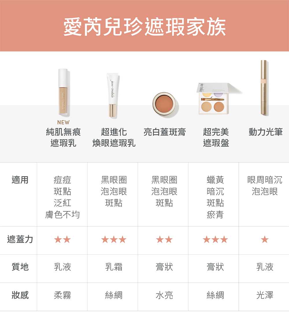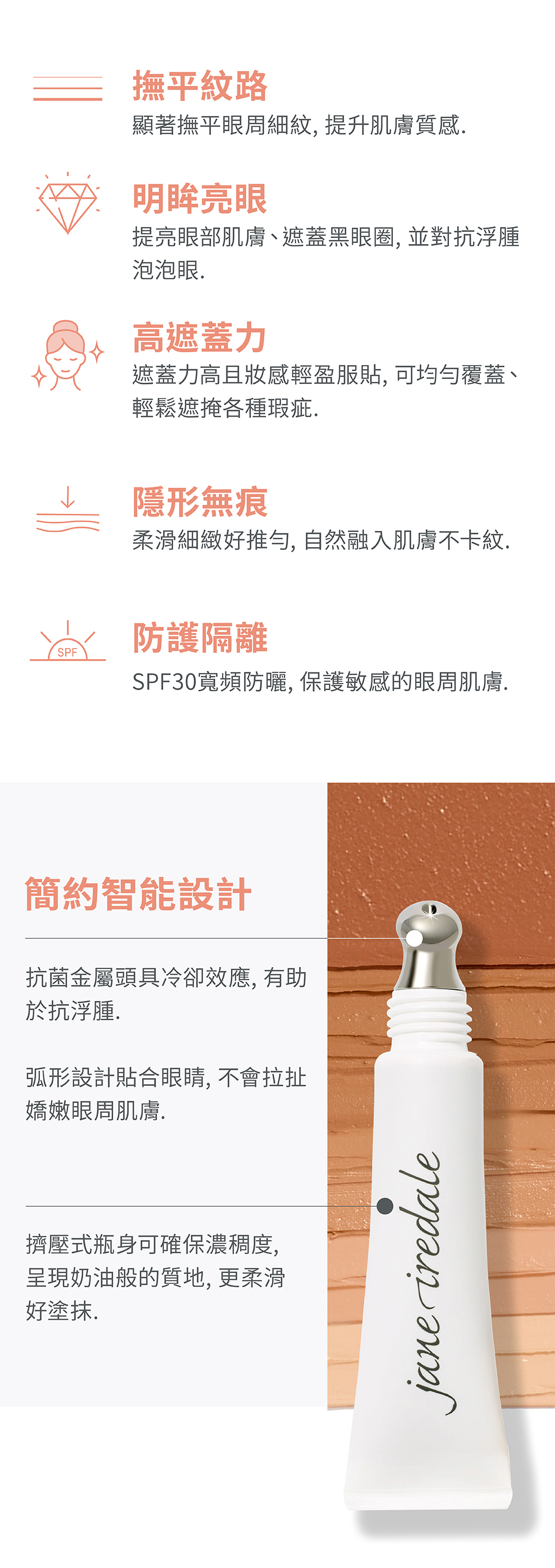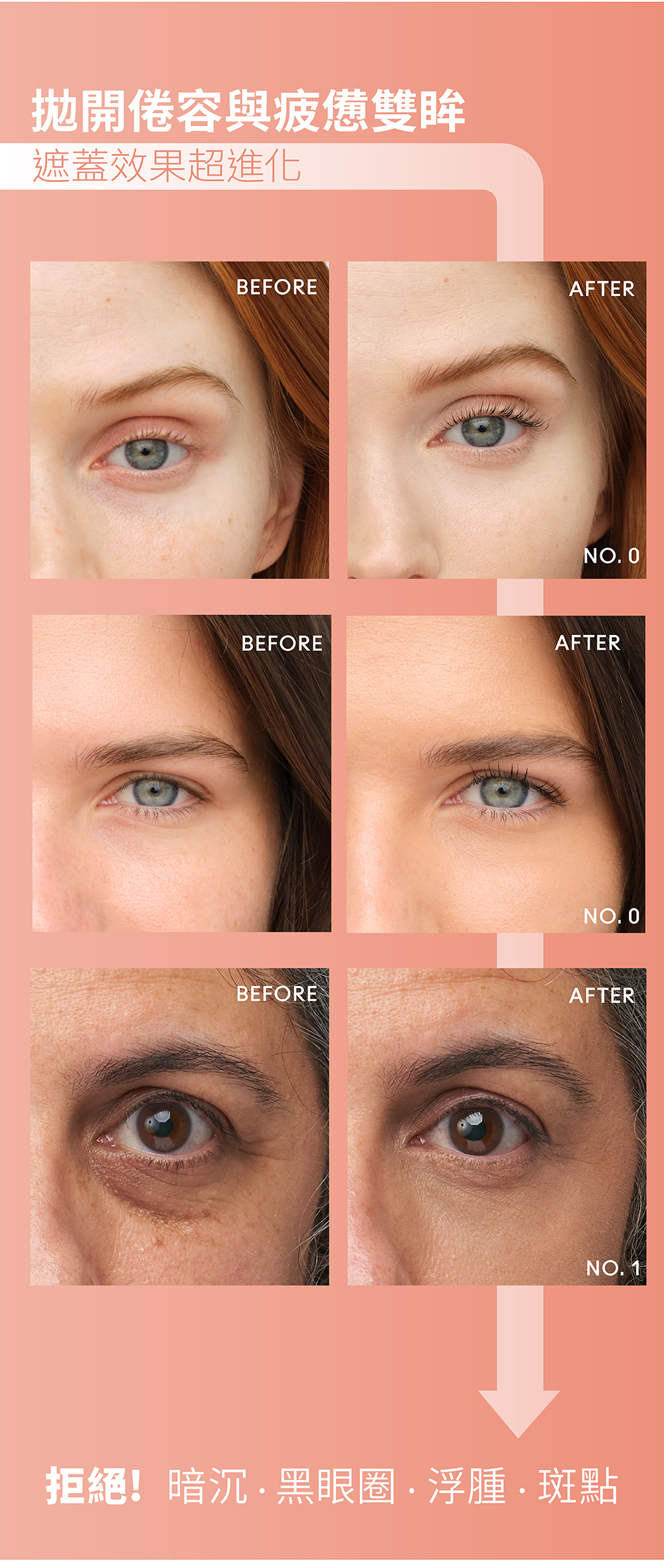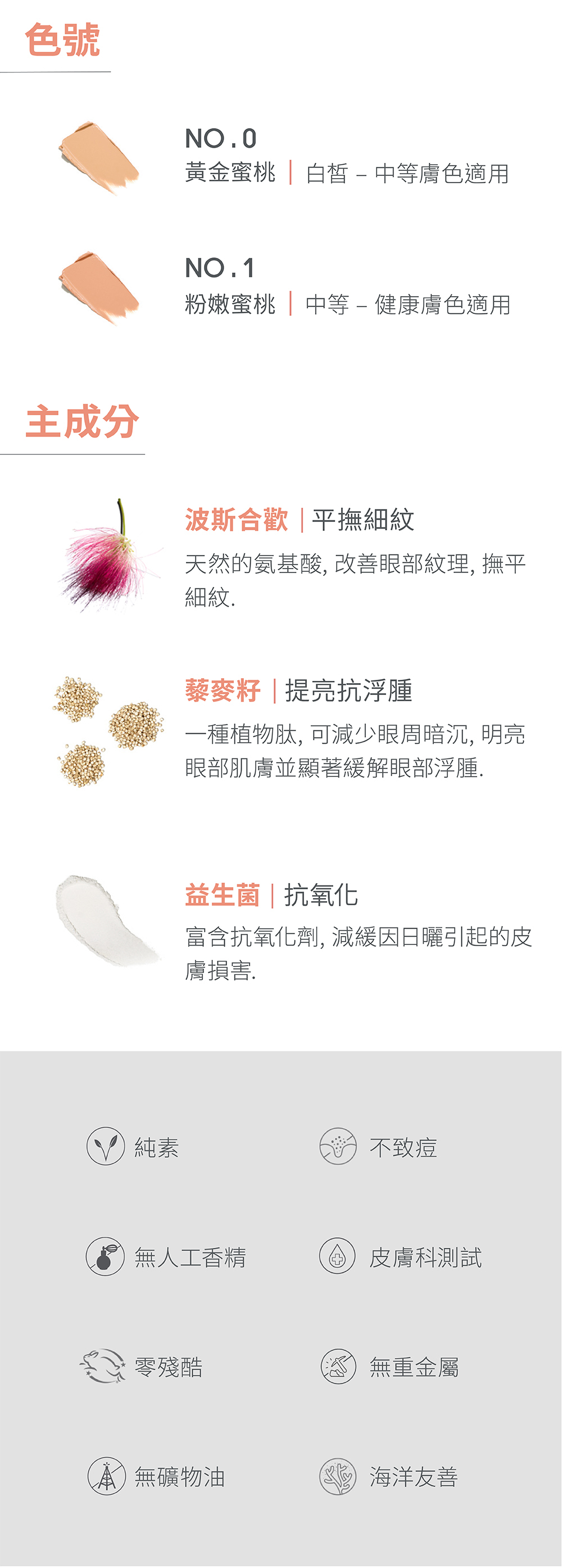 高遮蓋力遮瑕乳,蜜桃色調巧妙修飾黑眼圈、浮腫及臉部斑點問題,質地柔滑細緻輕鬆推勻,自然融入肌膚不卡紋,簡單一步,即可展現明眸亮顏。