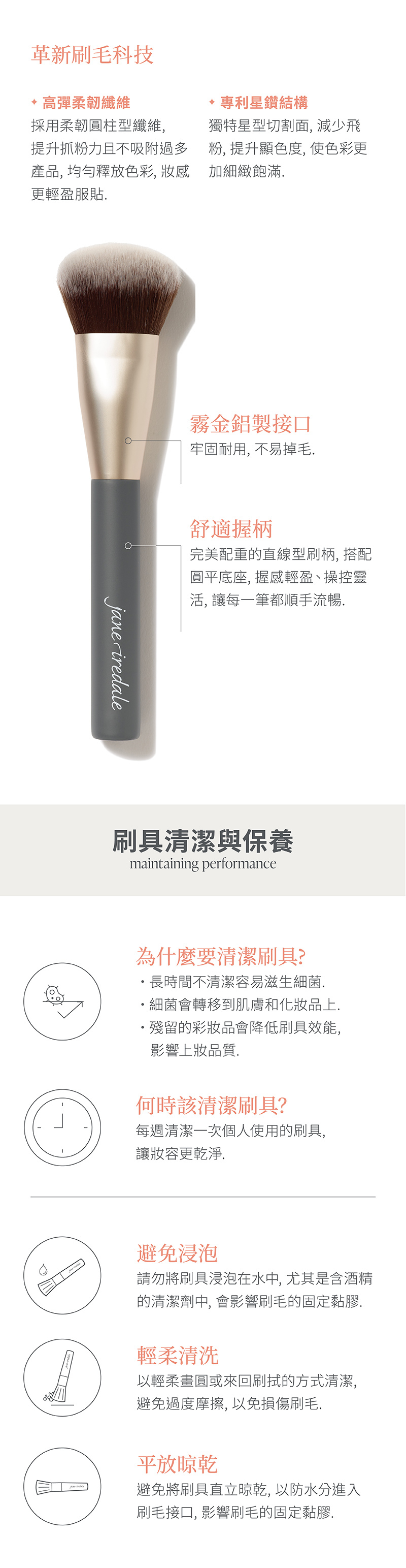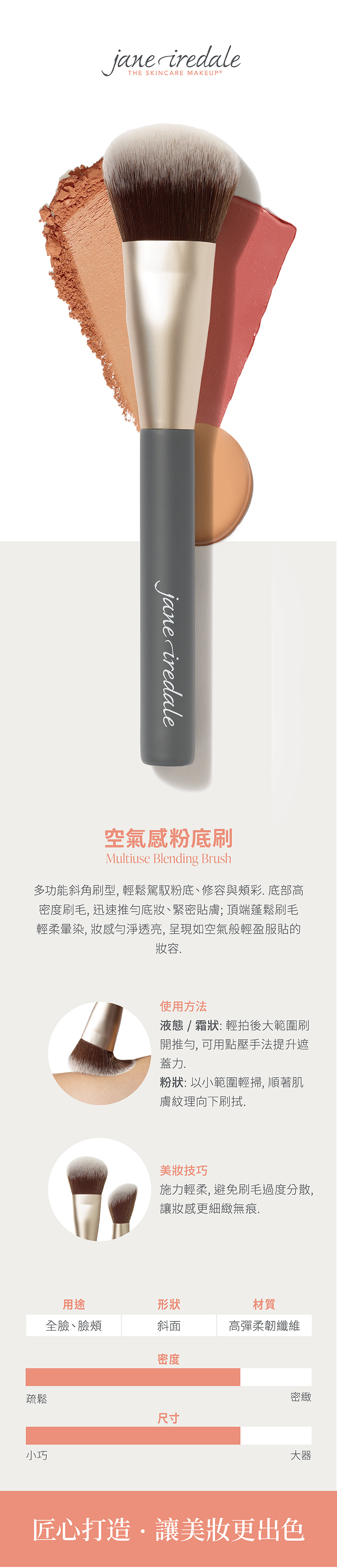 多功能斜角刷型,輕鬆駕馭粉底、修容與頰彩。底部高密度刷毛,迅速推勻底妝、緊密貼膚;頂端蓬鬆刷毛輕柔暈染,妝感勻淨透亮,呈現如空氣般輕盈服貼的妝容。