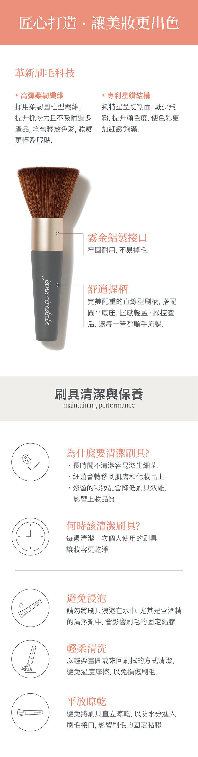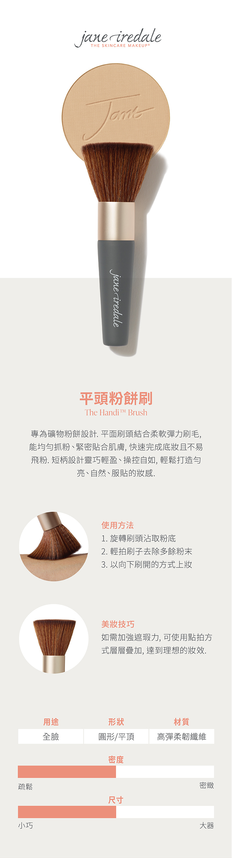 專為礦物粉餅設計,平面刷頭結合柔軟彈力刷毛,能均勻抓粉、緊密貼合肌膚,快速完成底妝且不易飛粉。短柄設計靈巧輕盈、操控自如,輕鬆打造勻亮、自然、服貼的妝感。