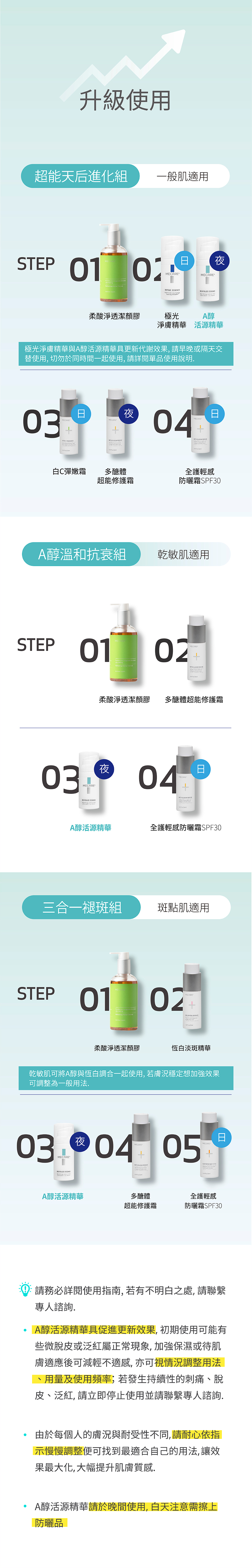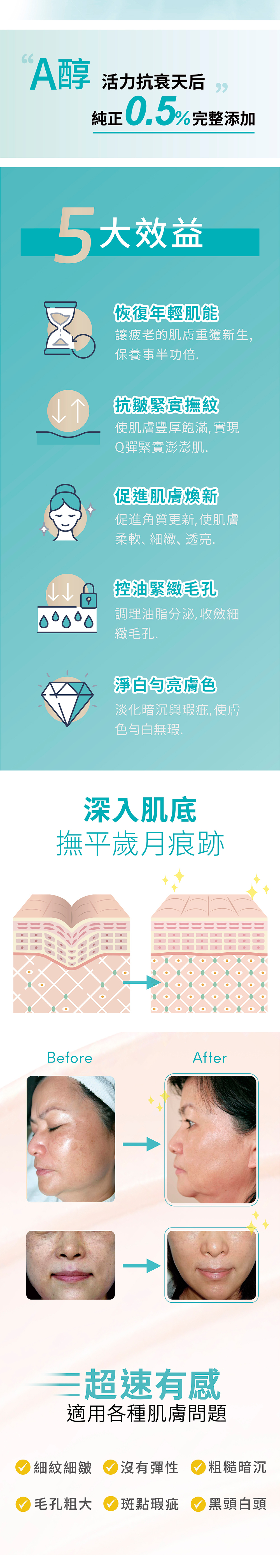 超速有感A醇活源精華,適用各種肌膚問題:細紋細皺、缺乏彈性、斑點瑕疵、粗糙暗沉、毛孔粗大、黑頭白頭
