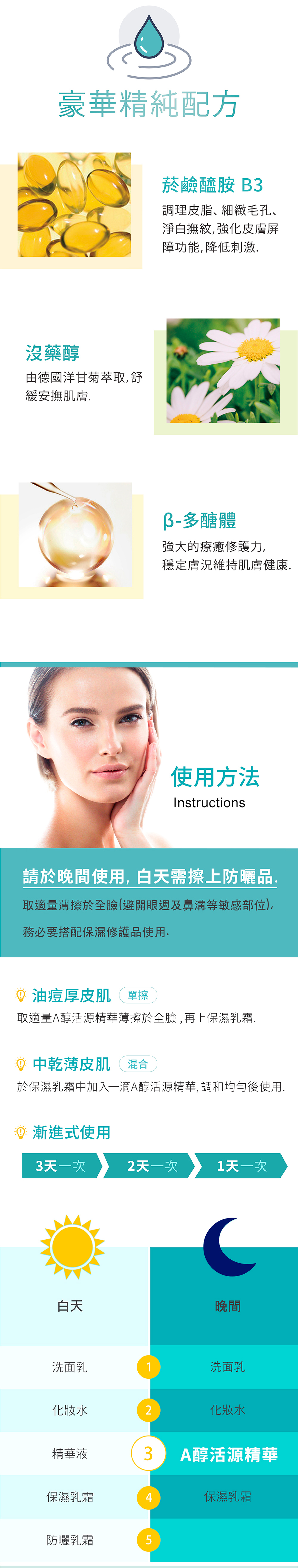 A醇活源精華請於晚間使用,白天需擦上防曬品,使用方法:取適量A醇活源精華薄擦全臉 (避開眼週及鼻溝等敏感部位),務必要搭配保濕修護品使用